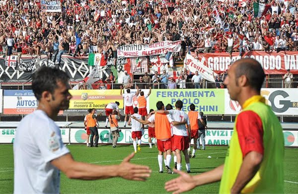 Vencedores e vencidos se cumprimentam. O Varese vai à final dos play-offs de seu grupo (Tutto Lega Pro)