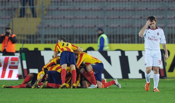 Lecce 1-1 Milan Apesar de Max Allegri jurar que não há alarme no ambiente milanista, é difícil crer que o treinador e os jogadores não estejam preocupados com o desempenho do time nos últimos jogos. Contra Cagliari e Udinese, o time jogou mal e arrancou pontos no finalzinho das partidas, graças a Cassano. Desta vez, Cassano e o Milan não foram brilhantes como o gol de Ibrahimovic e acabaram cedendo o empate ao Lecce, que presionou nos dez minutos finais e marcou com Olivera. O resultado premiou os esforços do time de De Canio, mais ligados no jogo.
