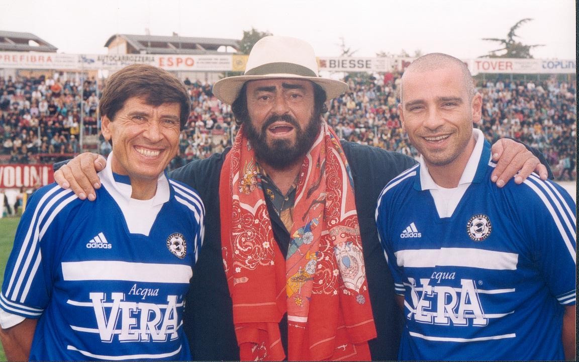 Morandi e Ramazzotti acompanhados pelo falecido tenor Pavarotti: música e futebol unidos para ajudar a quem precisa (NazionaleCantanti.com)