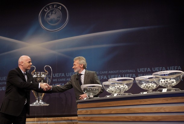 | Gianni Infantino e Paul Breitner comandaram a cerimônia de sorteio dos confrontos da primeira etapa do mata-mata europeu. Italianos terão duelos acessíveis (Reuters) |