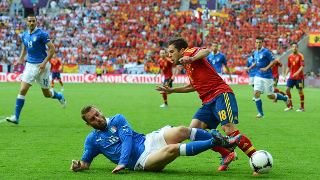 A ideia tática de Prandelli também privilegiaria os alas Maggio e Giaccherini, que em Napoli e Juventus, também jogam em um esquema com três zagueiros. No centro do meio-campo, Pirlo e Marchisio eram outros habituados ao sistema. A resposta de Vicente Del Bosque foi simples: escalou Fàbregas como um “falso nove” Fàbregas, em um 4-3-3, com liberdade de movimentação, para obrigar De Rossi a sair mais da área.