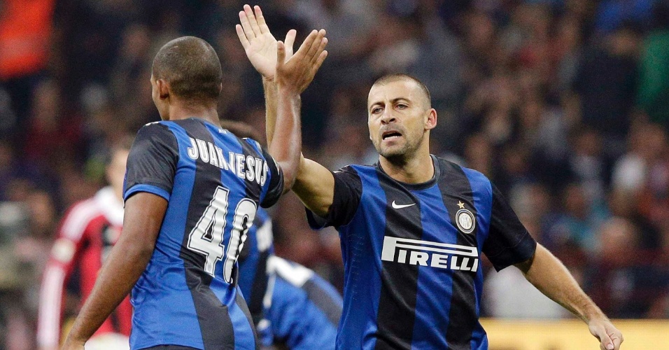 Samuel cumprimenta Juan: o argentino venceu todos os dérbis de Milão que disputou e, neste domingo, marcou o gol da vitória, além de ter sido muito sólido na defesa (Reuters)
