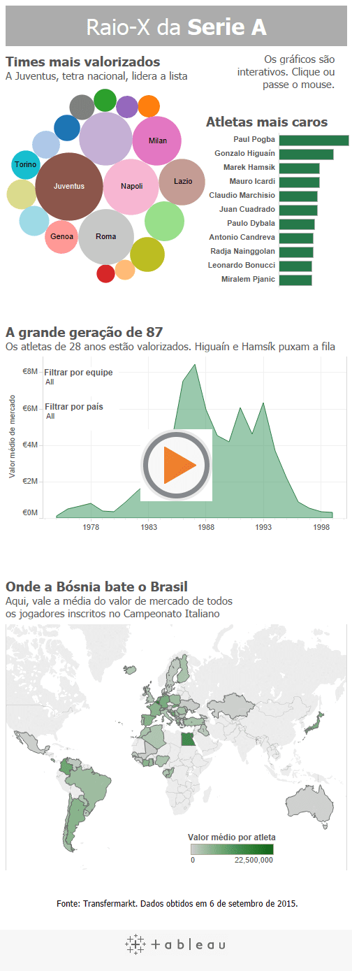 Você sabia que o elenco do Sassuolo é mais valorizado do que o do Torino? E que os atletas de 28 anos são os mais caros da Serie A? Essas curiosidades estão no infográfico preparado pelo Quattro Tratti. Dica: é possível navegar nos gráficos, principalmente naquele que aponta o valor médio dos atletas de cada idade.
