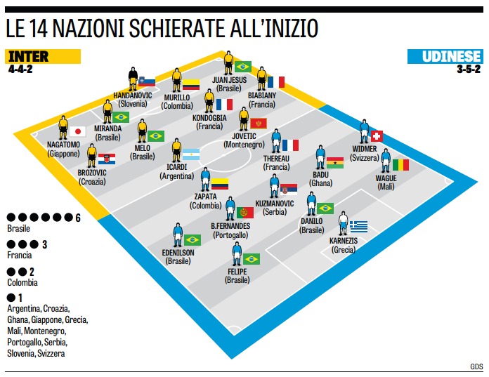 Os 22 estrangeiros de Inter-Udinese: pela primeira vez, a Serie A teve uma partida sem