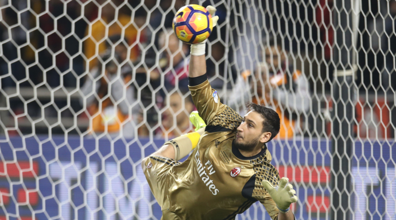 A defesaça de Donnarumma no pênalti cobrado por Dybala (Getty)