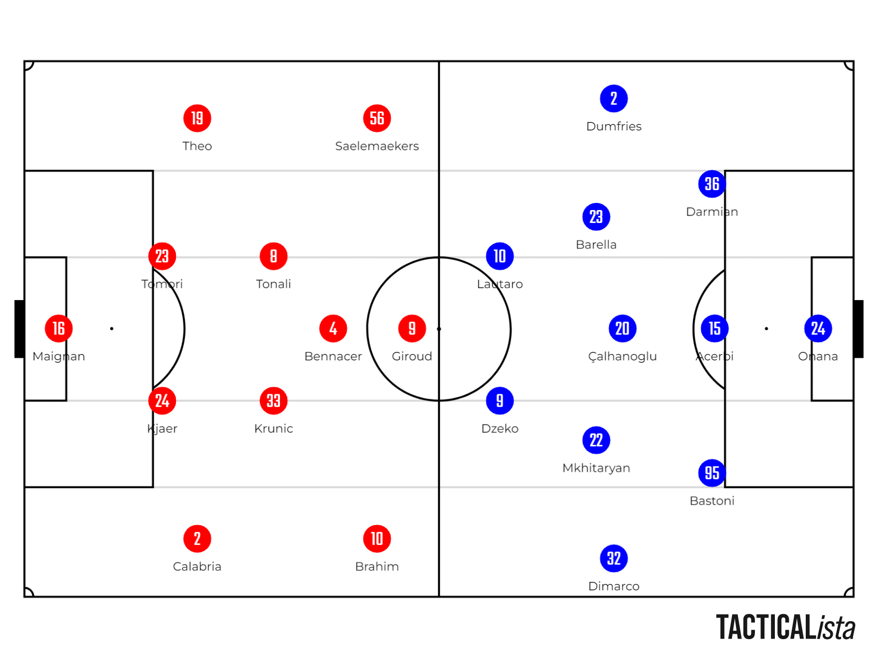 As escalações não apresentaram grandes surpresas: Stefano Pioli escolheu Saelamaekers como substituto de Rafael Leão, lesionado, e manteve Bennacer como uma peça mais avançada de meio-campo. Simone Inzaghi optou por manter o trio de meias com Çalhanoglu, Barella e Mkhitaryan, além de Dzeko no ataque, tendo Lukaku como opção no banco de reservas.
