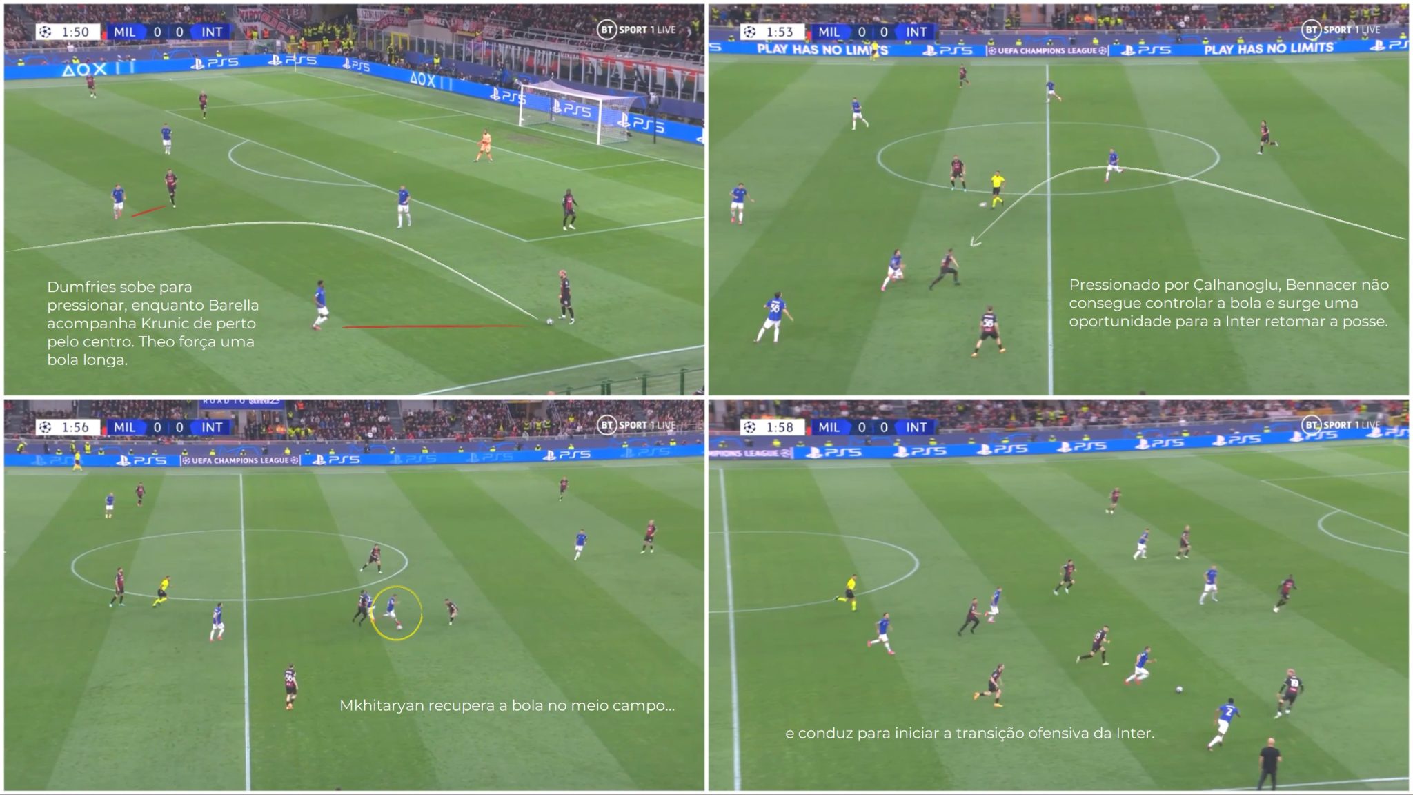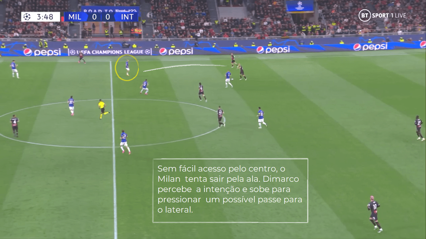 No setor esquerdo, Dimarco saltava para pressionar Calabria quando a saída de bola era induzida a ocorrer por ali; pela direita, Barella e Dumfries se alternavam nesse mesmo tipo de ação. Esse mecanismo de pressão forçou o Milan a buscar lançamentos longos, facilmente controlados pelos zagueiros da Inter e com pelotas recuperadas pelo trio de meio-campo.