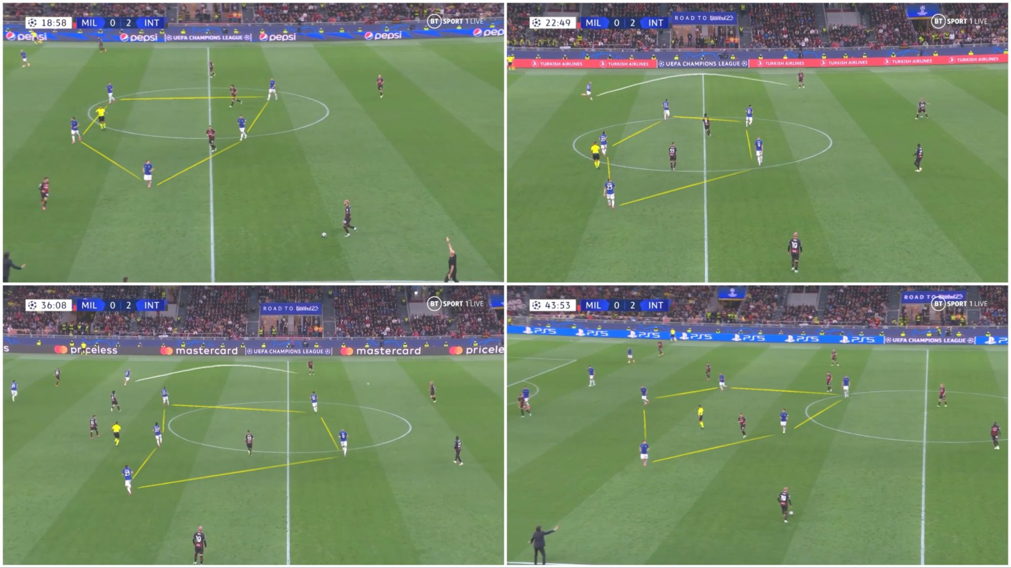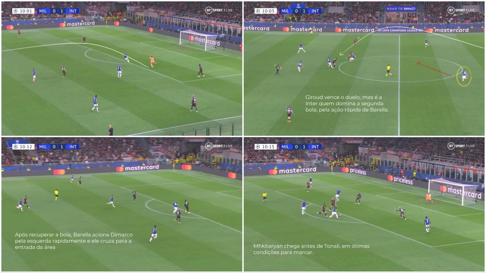 Essa sequência aconteceu também no lance que originou o segundo gol. Tonali e Krunic se moveram à frente da defesa no intuito de criarem espaço, mas foram acompanhados por Mkhitaryan e Barella, respectivamente. Na saída de bola, Maignan foi forçado a utilizar seu pé esquerdo pela corrida de Lautaro, enquanto Dumfries se preparava para pressionar Hernandez na lateral. O goleiro francês optou pelo passe longo, buscando Giroud – a partir daí, a Inter retomou a posse e finalizou seu ataque rapidamente.
