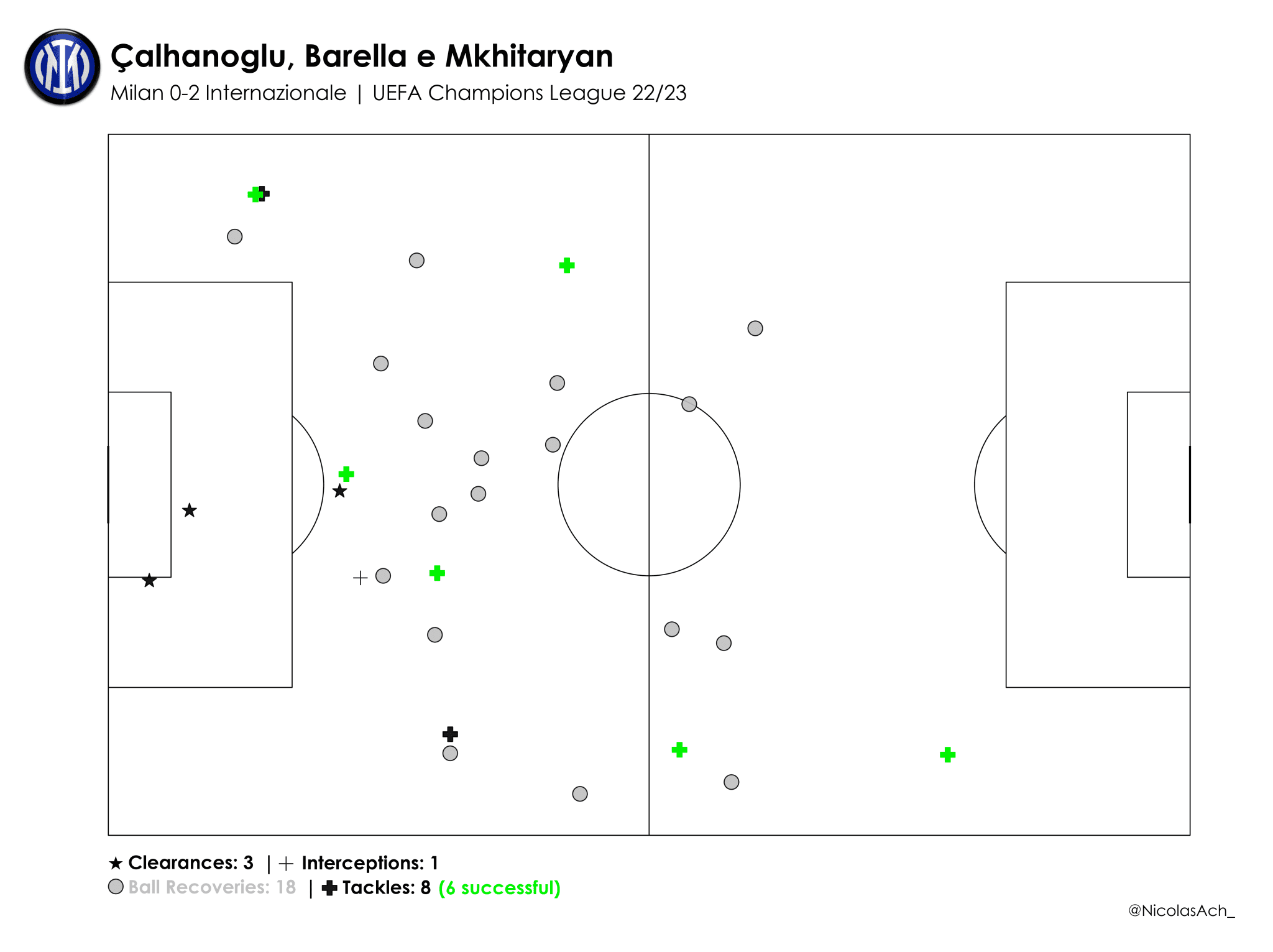 O trio de meio-campo da Inter fez grande partida, vencendo boa parte dos duelos pelo centro e forçando erros do Milan. Juntos, os três somaram 18 recuperações de bola, três cortes, uma interceptação e oito tentativas de desarmes, sendo seis bem-sucedidas.