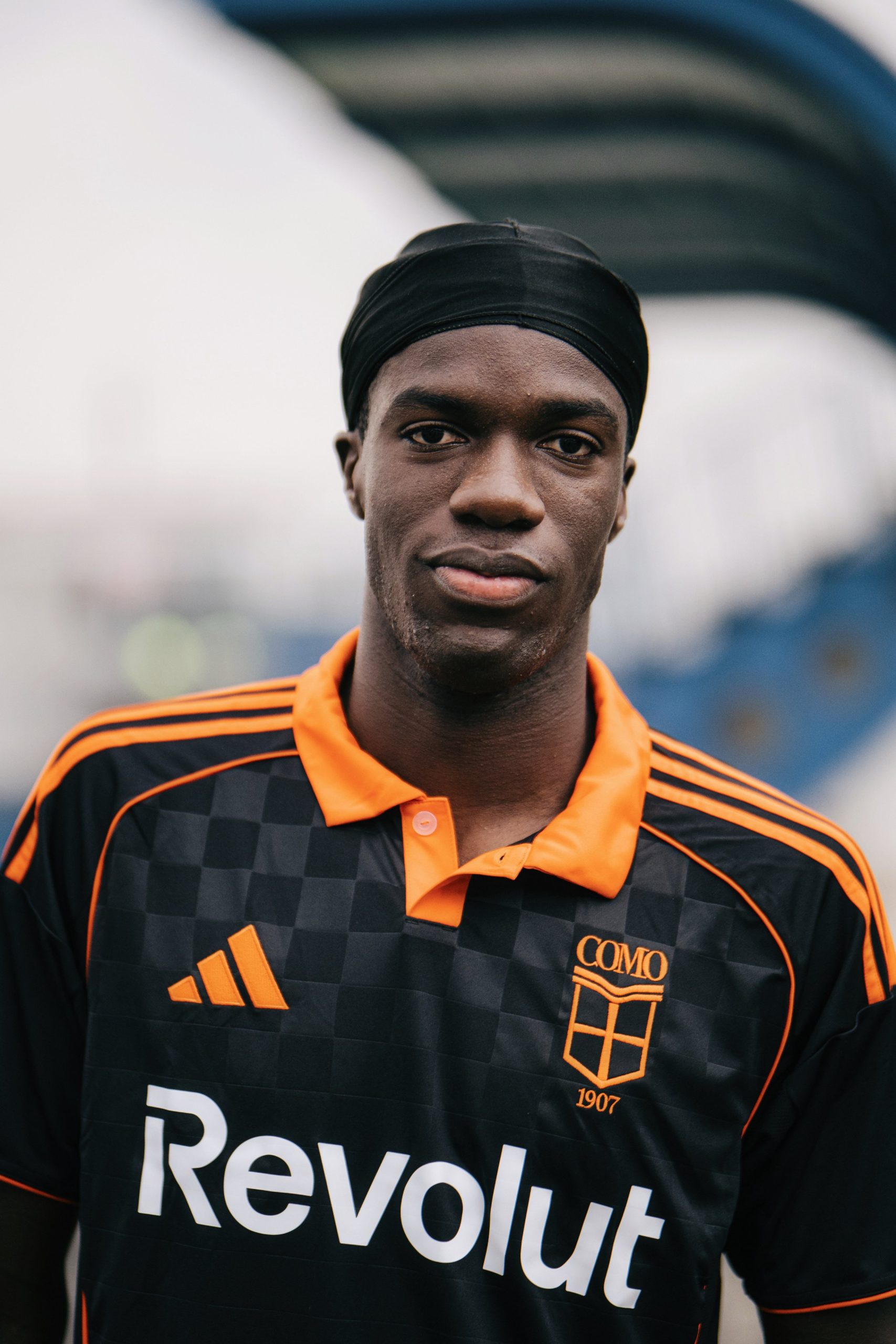 Em preto e laranja, com detalhes quadriculados, o terceiro uniforme do Como traz escudo clássico do clube e patrocinador alternativo